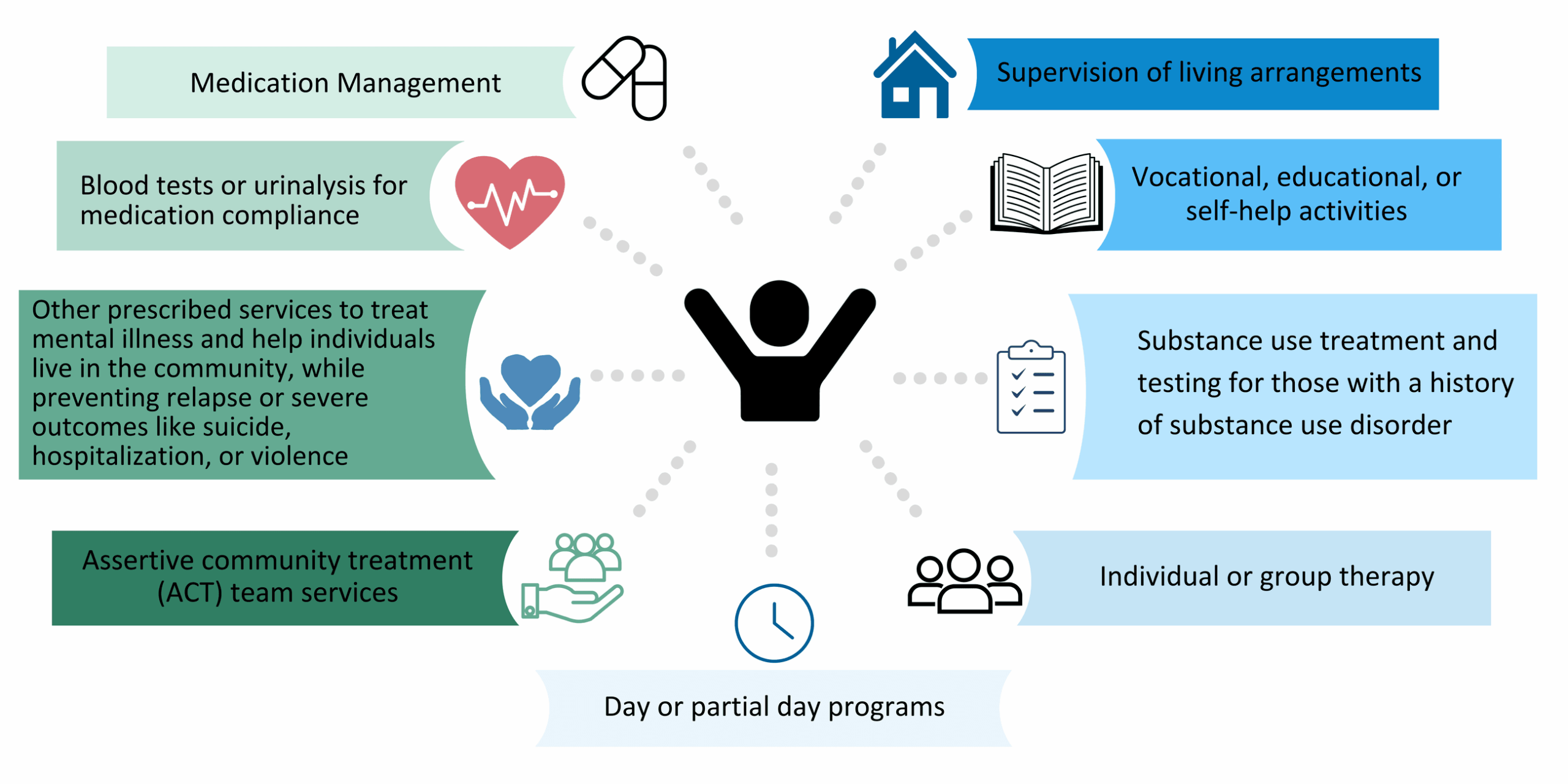 AOT includes a casement management plan and services for care coordination, supervised by a psychiatrist, and developed through person-centered planning. AOT may also include services such as: